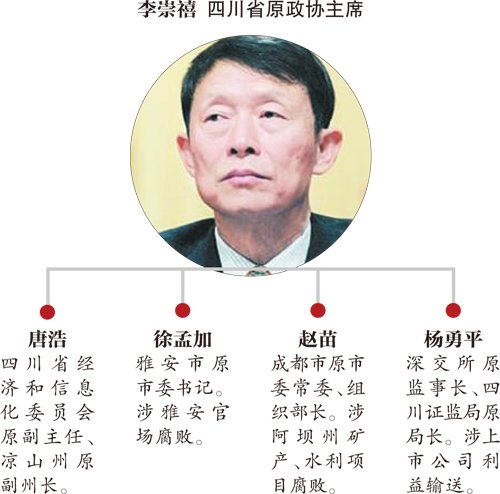 在落马的四川官员中,四川省原政协主席李崇禧是一个很重要的角色。知情人士透露,李担任省部级干部十多年,“门生”遍布四川。他的人脉和影响远超过李春城和郭永祥。