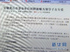 这是网络上对此次招聘事件的转载(1月1日摄)。 针对网络上近日强烈质疑安徽省黄山市徽州区事业单位招聘完完全全为领导子女专设一事,新华社中国网事记者2010年12月31日采访了徽州区