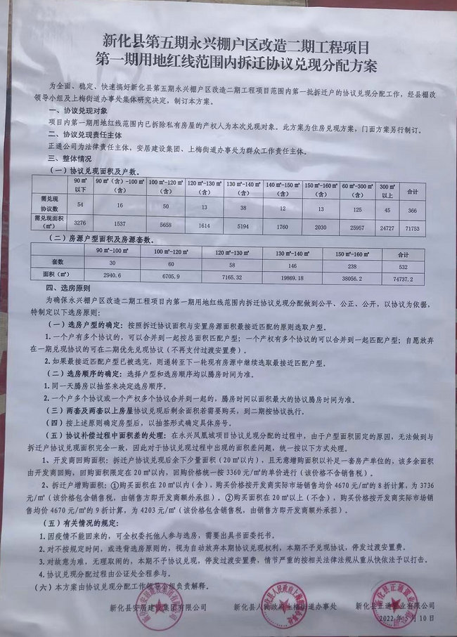 2022年5月10日,由新化县安居建设集团、新化县上梅街道办事处和正通置业有限公司联合公布的《新化县第五期永兴棚户区改造二期工程拆迁兑现分配方案》,完全违背了以前拆迁时开发商与拆迁户签定的拆迁安置补偿协议,在法律层面是站不住脚的!