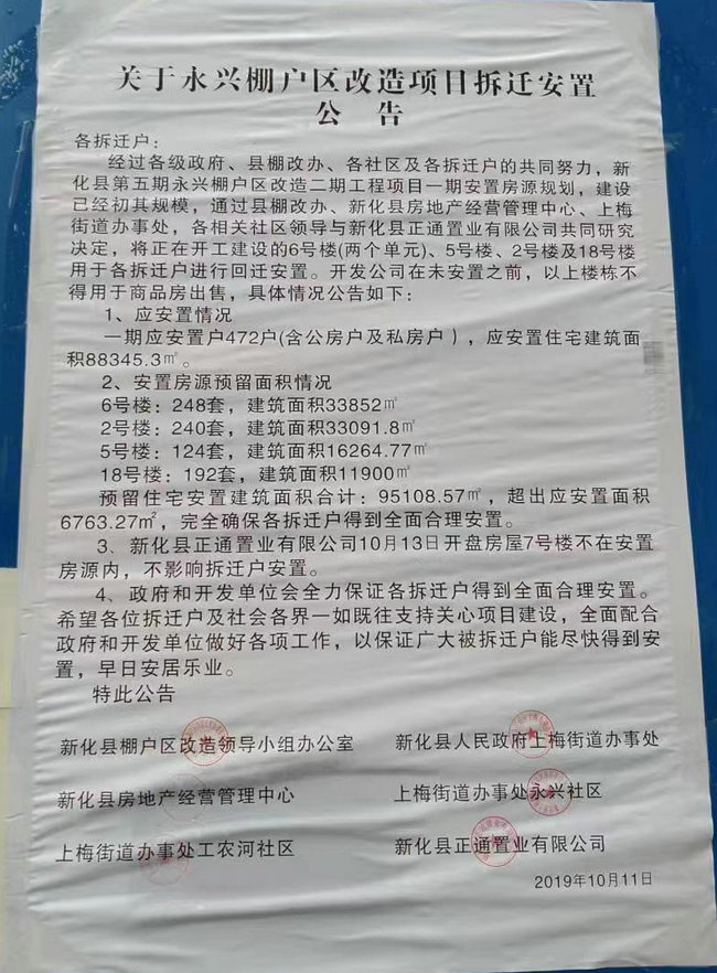 新化县城其它的拆迁安置项目都是先安置拆迁户再向外出售多建的商品房,只有永兴棚户区是个例外。并且19年公告的拆迁安置房源也有一部分不翼而飞,背后的真相是什么?是开发商单方面的行为,还是涉及到利益输送?