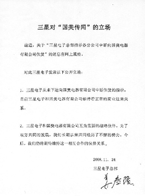 昨日晚间,国美电器给记者发来三星的供货声援函。