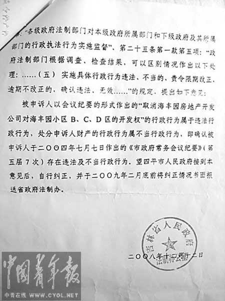 实际上,早在2008年12月12日,吉林省政府法制办已向四平市政府下达《行政执法监督意见书》,认定四平市政府2004年7月7日作出的《市政府常务会议纪要》(第五届7次)存在违法及不当行政行为,“望四平市政府接到本意见后,自行纠正,并于2009年2月底前将纠正情况书面报送省政府法制办”。