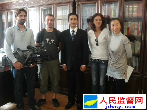 记者朱瑞峰接受德国电视一台北京记者处首席记者安珂丽(右二)专访