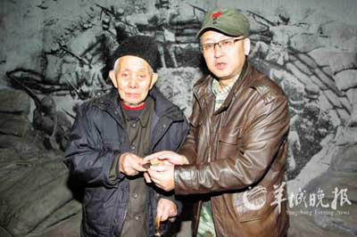 在“中国老兵手印广场”,老人留下了右手的手印。他说,他看到中央电视台播出的《峥嵘岁月》,简直不敢相信真有纪念正面战场抗战的博物馆,于是让侄儿带他来这里。他掏出一个小木盒,推开盖子,里面是三枚铜质证章:“抗战胜利章”(编号6716),“中训团军真蓉荣誉章军官证No.191”和一枚上有“24中队3909”字样的证章。“我要在淞沪会战的展厅里,把这三枚证章捐赠给建川博物馆。”杨根奎说。