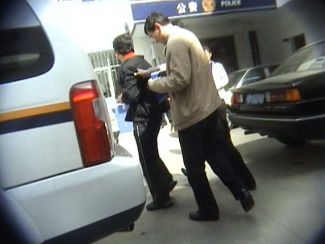 图:李新华被三门峡警方押向警车,穿红色内衣的为犯罪嫌疑人李新华,左为三门峡公安局侦查员、崤山路派出所所长王琨