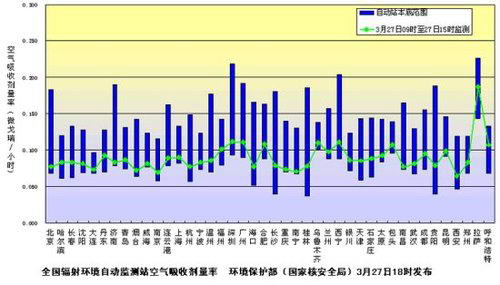 环境保护部(国家核安全局)3月27日18时继续发布的全国省会城市和部分地级市辐射环境自动监测站实时连续空气吸收剂量率监测值。