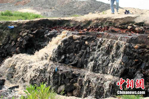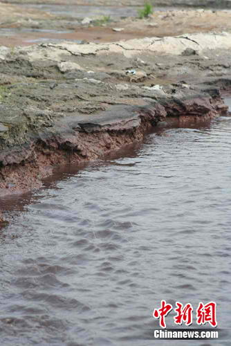 工业污水在滩涂上流淌,两岸的泥土也被”染“成黑褐色。王剑 摄