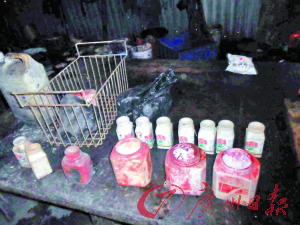 1 作坊内摆放着敌百虫和着色剂。