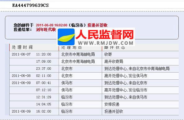 本图:人民监督网书面采访纪委书记沈庆华的签收凭据