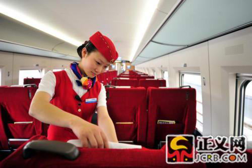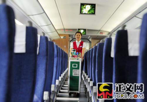 京沪高铁 高速动车车厢和提供优质服务的列车员。