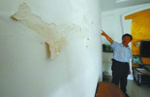 居民宋习和家安置房的客厅墙面出现大面积脱落(7月25日摄)。新华社记者 李健 摄