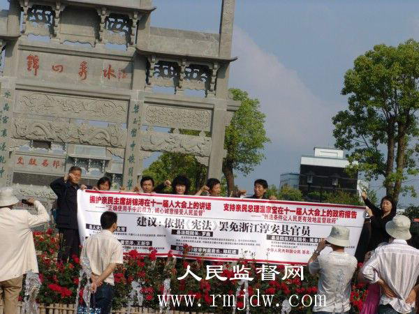 2008年5月10日,浙江省淳安县千岛湖风景区旅游码头,众位公民打着横幅:“拥护亲民主席胡锦涛在十一届人大会上的讲话,——“正确使用手中的权力,诚心诚意接受人民监督”。支持亲民总理温家宝在十一届人大会上的政府报告,——“创造条件让人民更有效地监督政府”。依据《宪法》罢免浙江淳安县官员—— 县人大主任余永青;淳安县汾口镇长董贤泽、王新华;县法院院长罗鑫;县法院执行局局长姚春妹;县法院行政审判庭庭长郑红进。