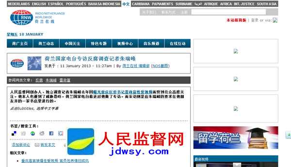 人民监督网创办人、独立调查记者朱瑞峰去年因曝光重庆区委书记雷政富性爱视频而受到公众高度关注。他本人也遭到了威胁恐吓。荷兰国家电台最近对他做了专访。而采访则是应朱瑞峰的要求在他朋友开的一家书店里进行的。