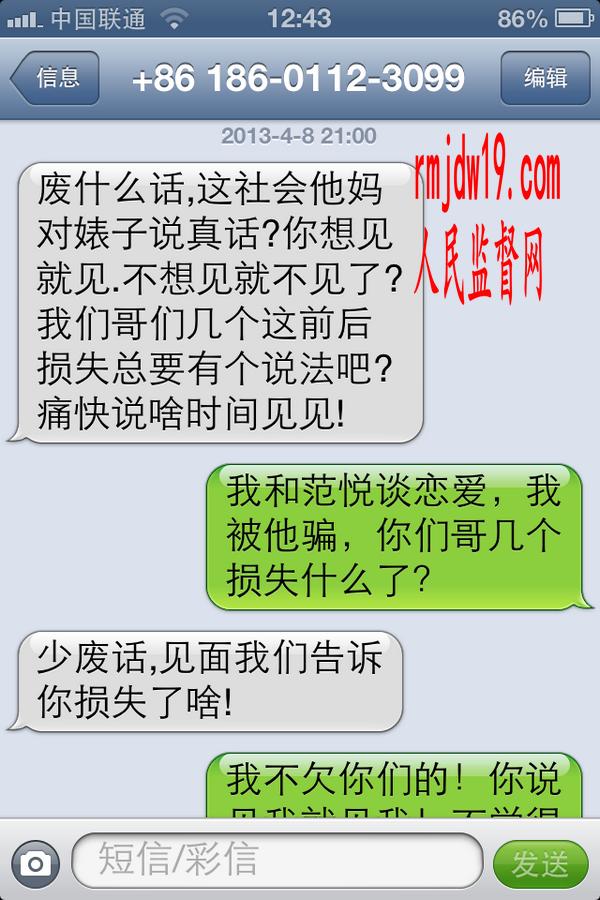 图:中南海高官范悦、浙商金忠等人向纪英男讨债的短信截图