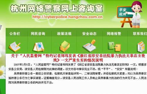 本图:2007年3月17日12点03分10秒,杭州网络警察网发表的声明