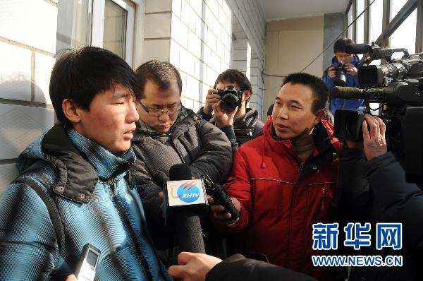 1月26日,媒体记者在庭审结束后采访在河北大学校园车祸案中死亡的陈晓凤的哥哥陈林(左一)。当日,河北大学“10·16”校园车祸案在河北省望都县人民法院公开开庭审理。 新华社记者 巩志宏 摄