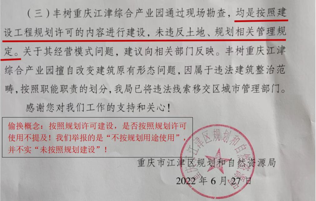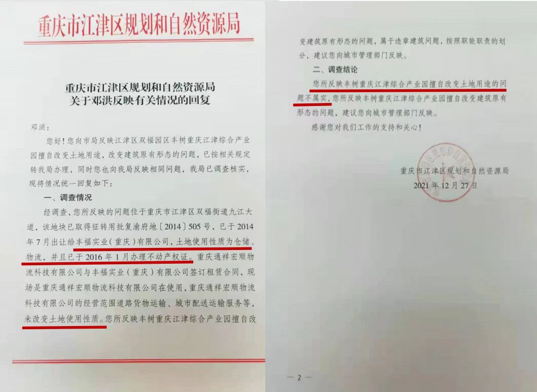 在第一次向相关部门举报通祥物流园擅自改变土地用途,改造建筑原有形态,违规经营物流综合市场业务的情况。得到了一个与客观事实严重失实的回复函中提到:“该地块已取得征转用批复渝府地[2014]505号,已于2014年7月出让给丰福实业(重庆)有限公司,土地使用性质为仓储、物流,并且已于2016年1月办理不动产权证。”且做出结论:“您所反映丰树重庆江津综合产业园擅自改变土地用途的问题不属实。”