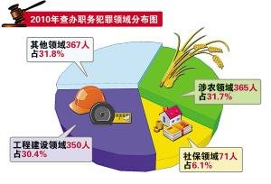 市检察院检察长余敏介绍说,检察机关2010年共查办贪污贿赂犯罪976人、渎职侵权犯罪177人,其中厅级以上干部15人、处级干部235人;贪污贿赂10万元以上的大案543人、100万元以上的54人,渎职侵权重特大案件82人。其中,查办民生、工程建设领域职务犯罪达833人,占立案总数的72.2%。在打黑除恶斗争中查处揭露出来的职务犯罪177人,其中司法人员87人。