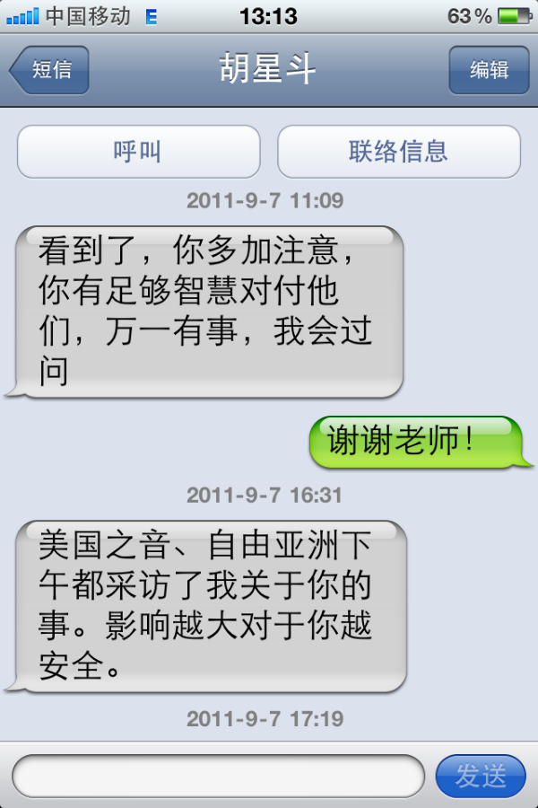 二、2011971631分,胡星斗教授发来手机短信:《美国之音》、《自由亚洲》下午都采访了我关于你的事。影响越大对于你越安全。