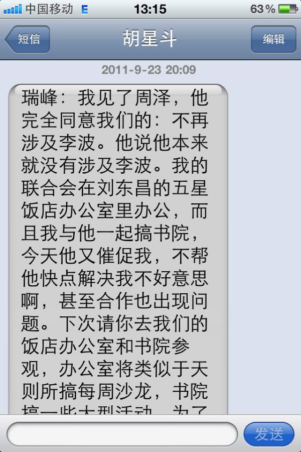 五、20119232009分,胡星斗教授发来手机短信:瑞峰:我见了周泽,他完全同意我的:不再涉及李波。他说他本来就没有涉及李波。我的联合会(国际著名企业家慈善家联合会)在刘东昌的五星饭店办公室里办公,而且我与他一起搞书院,今天他又催促我,不帮他快点解决我不好意思啊,甚至合作也出现问题。下次请你去我们的饭店办公室和书院参观,办公室将类似于天则所搞每周沙龙,书院搞一些大型活动。为了我与他的合作顺利,还是请尽快删除李波的内容,不妨碍继续整个案件。今天他说最好今天能删除,我怎么回答他啊?