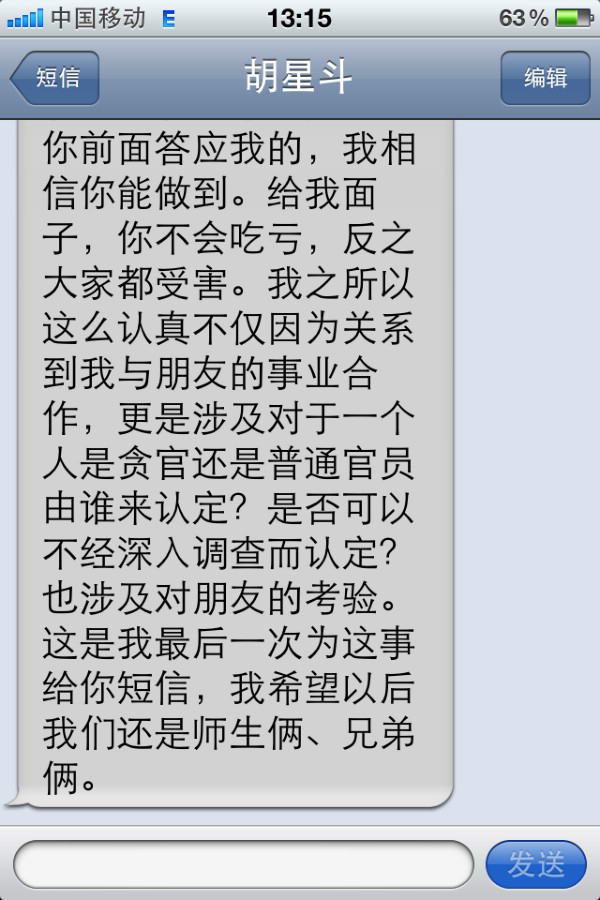 七、20119241855分,胡星斗教授发来手机短信:瑞峰:我希望你近两天把李波删除吧。你认准了李波是贪官,有证据吗?深入调查了吗?仅凭养狗和个别人的言论?你这样做太危险了,李波其实是一块肥肉。我俩就不要争论谁是真正的反腐败了,你知我知。我不希望我俩兄弟分裂,我们兄弟的分裂会立即让微博和所有的记者、朋友热议。你前面答应我的,我相信你能做到。给我面子,你不会吃亏,反之大家都受害。我之所以这么认真不仅因为关系到我与朋友的事业合作,更是涉及对于一个人是贪官还是普通官员由谁来认定?是否可以不经调查而认定?也涉及对朋友的考验。这是我最后一次为这事给你短信,我希望以后我们还是师生俩、兄弟俩。