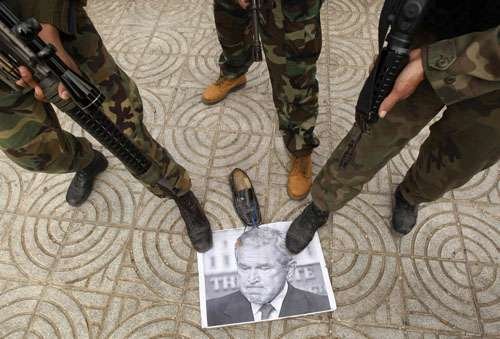在巴勒斯坦的示威者也脚踩布什头像