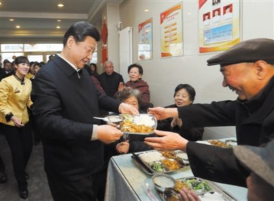 2013年2月4日,兰州一家“虚拟养老院”的养老餐厅,习近平端起一个盛满饭菜的餐盘,走到72岁的老人杨林太面前,轻轻送上,请他用餐。新华社记者 兰红光 摄