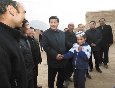 2013年2月3日,临夏回族自治州东乡族自治县布楞沟村,习近平拉着村民儿子的手,和大家亲切交谈。新华社记者 兰红光 摄