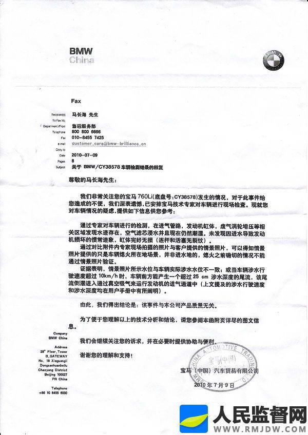 201079,马长海终于得到了一份宝马中国)汽车贸易有限公司的回复: